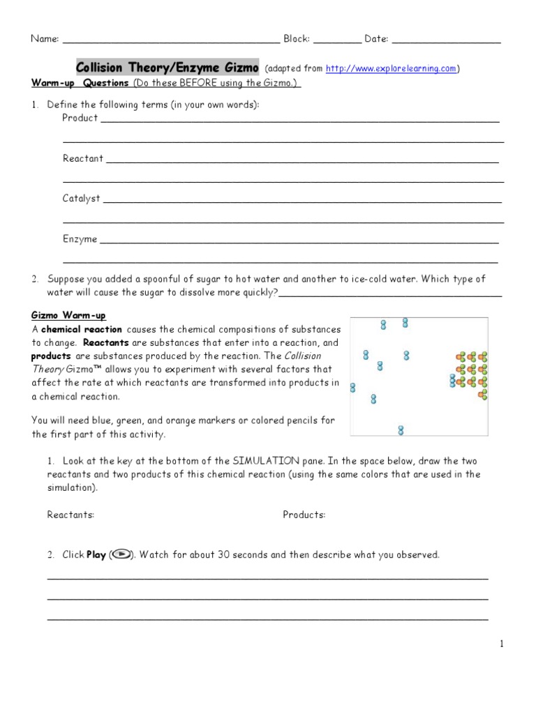 Collisiontheory Student Exploration Sheet Reaction Rate Chemical Reactions from imgv2-2-f.scribdassets.com When discussing conservation of momentum, we considered examples in which two objects collide and stick together, and either there are no external forces. This is the collision theory vocabulary document translated into french. Collision theory gizmo answer the collision theory gizmo™ allows you to experiment with several factors that affect the rate at which reactants are transformed into products in a chemical reaction. Collision theory gizmo answer key gizmo answer key by online. The collision theory gizmo allows you to experiment with several factors that affect the rate at which reactants are transformed into products in a chemical reaction. Ninth grade lesson reaction rate demonstrations. In this activity, you will simulate chemical reactions and manipulate various variables to determine the time for the reactions to fully occur. Overview of the explorelearning collision theory gizmo.